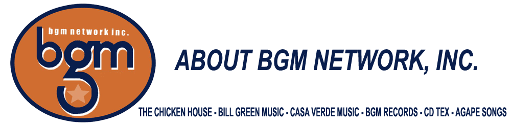 facility at The CHICKEN HOUSE in Eldorado, Texas. BGM RECORDS: Established in 1980, BGM is credited with Grammy nominations on Johnny Bush, Lantana, and Doug Kershaw (featuring Hank Williams, Jr., and Fats Domino). In addition, Beth Williams was an ACM nominee for 'Best New Female Vocalist' in 1988. BGM Records includes Billboard, R&R, and Cashbox chart singles on Kenny Dale, Beth Williams, Doug Kershaw & Hank Williams, Jr., Easy Money f/ Toby Keith, Clay Blaker, Johnny Bush, Billy Mata, Bill Green, and others. Texas Regional Chart Toppers include three, #1 singles by TJ Broscoff, and two of his songs featured at the Woodstock Film Festival in the fall of 2014. Most recently the track "Whiskey River" from Johnny Bush's last album, THE ABSOLUTE JOHNNY BUSH, is a feature in the movie, "Death in Texas" with Bruce Dern. CD TEX: CD Tex is a music and video delivery service for independent labels and artists. Every week, CD TEX delivers music and/or videos to over 1100 radio stations, media, and industry subscribers. In addition, BGM produces the popular syndicated CD TEX Radio Show which can be heard on many local and international radio affiliates and web casts. AGAPE